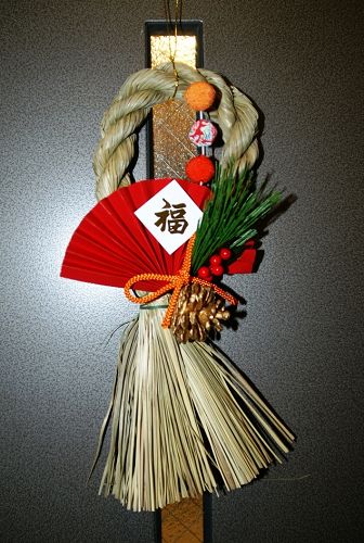 (5)の「しめ飾り」は新しい年の神様(「年神様」)をお迎えするために飾るものです。自分の家が神聖な場所であることを示すために飾ります。玄関口や家の神棚に飾ります。自動車に飾る人もいます。私の家でも、小さなしめ飾りを買って、玄関の戸に飾りました。「福」という漢字が書いてあるものを買いましたが、このような字が無いしめ飾りも沢山あります。日本では「福」という字を逆さまに倒して飾る習慣はないので、この点は中国とは異なります。