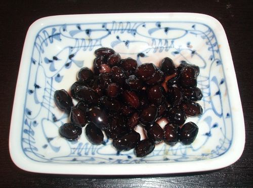 ①「黒豆」:まめに(=丈夫に)暮らせるようにとの願いが込められたもの。甘煮にします。この点、中国での豆の食べ方と異なります。(写真1)