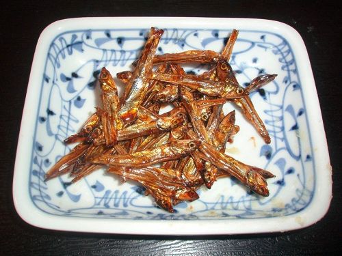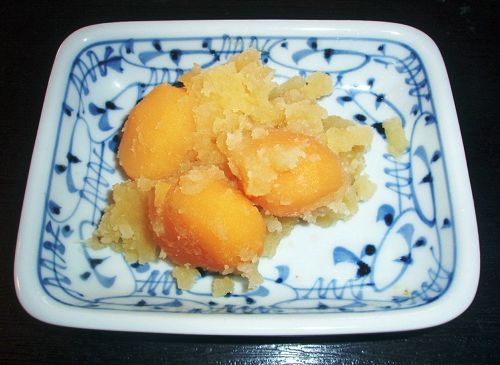 ②「ごまめ」(「田作り」):カタクチイワシの幼魚の煮干しを、から煎り(=お鍋にいれて、水分をとばす)します。そしてしょうゆ、みりんなどを煮詰めて、からめたもの。中国では「みりん」は殆ど使わないと思いますが、米のでんぷんを糖化させたもので、アルコール飲料の一種ですが、調味料として使われます。カタクチイワシは、良い田をつくるための高級肥料としても使われていたので、そのためこの「ごまめ」は別名「田作り」とも呼ばれ、豊年豊作を祈願します(写真2)