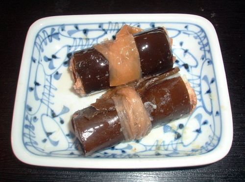 ③「昆布巻き」:野菜、魚などを昆布でまいて、かんぴょうでしばりって、甘辛く煮たもの。「昆布巻き(こぶまき)」と「よろこぶ」の語呂を合わせて、縁起物として食べられます。(写真3)