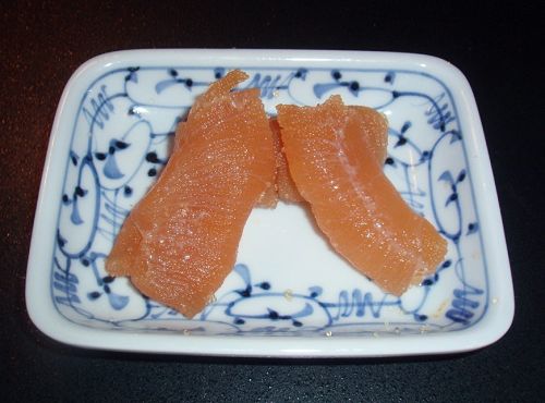 ⑤「数の子」:にしんの卵巣を塩漬けにしたもの。卵が多いことから、子孫繁栄の願いをかけます。また二親(にしん)(=両親)が健在であることを祈る意味もあります。(写真5)