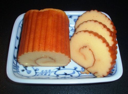 ⑥「だて巻き」:卵地に白身魚のすり身を混ぜて焼いた厚焼き卵を、すだれで渦巻き状に巻いた者。華やかさのある料理です。「伊達」とは、華やかさ、派手さを表します。また巻物の形から、文書、文化の発展を願う意味もあります。(写真6)