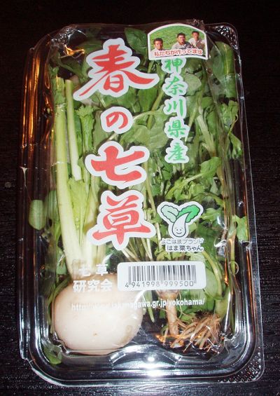 「七草がゆ」に入れる菜は、昔は家の周りで集めることもできました。しかし、都市化が進んだ東京近郊では、今やお店で買うしかありません。私の家も、近所のスーパーマーケットでパッケージ入りのセットを買い求めました(写真2)。398円でした(=約25人民元)。