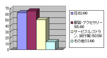 日本ではお花を贈るのは少ないように思いますが、中国では、まずはバラの花が重要だと見受けられます。2月14日にはバラの値段が高騰し、夜になると安くなると聞きました。上記のサーチナの調査で、プレゼントをすると答えた男性に対して、何をプレゼントするかを質問したところ、以下の回答がありました(複数回答可)。